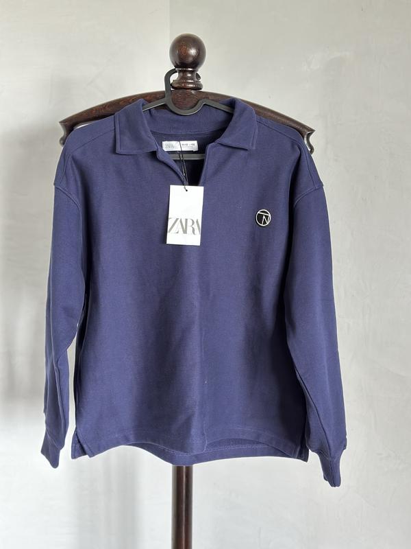 Кофта -свитшот поло Zara. На зріст 152 см., на 11-12 років. 97% коттон. Темно-синій колір. Заміри: Напівобхват плечей-51 см. Напівобхват грудей-52 см. Довжина-59.5 см. Довжина рукава -52 см.