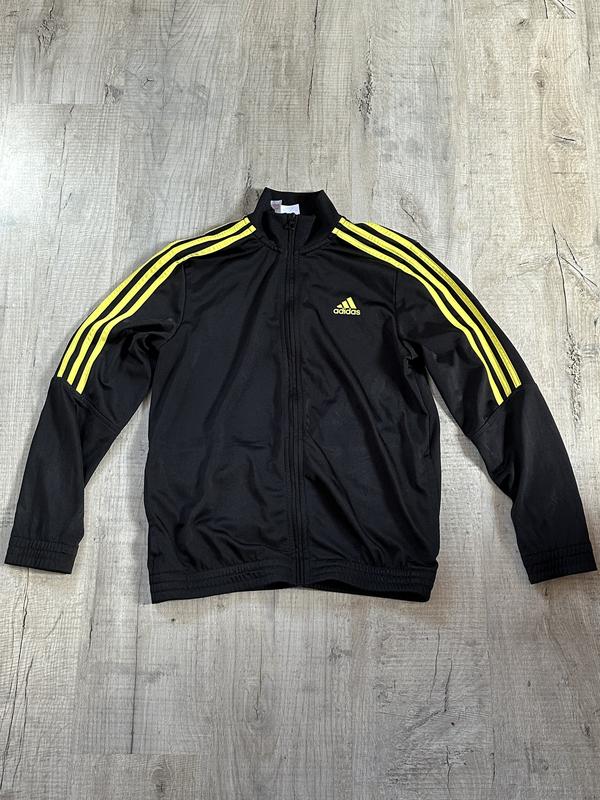 Чорна олімпійка Adidas з жовтими смужками, 13/14 років (ріст 158–168 см) Стильна чорна олімпійка Adidas з жовтими фірмовими смужками на рукавах. Оригінал. Розмір 13–14 років, підійде на ріст 158–168 см. Відмінний стан, без дефектів. Заміри в дірект