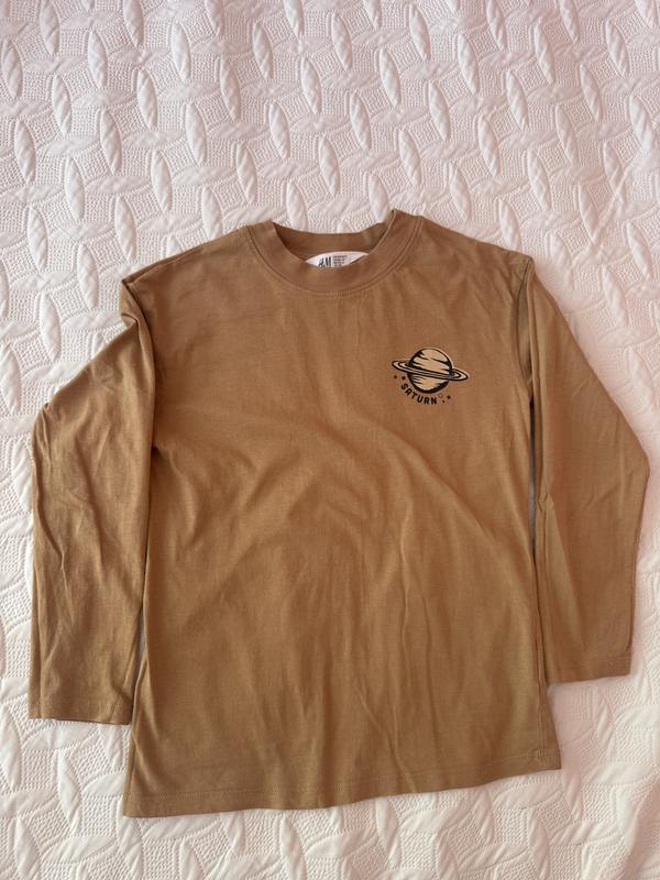 👕 Дитячий лонгслів H&M з принтом “Saturn” Розмір: 6-8р Колір: теплий коричневий. Стильна базова модель з довгим рукавом та оригінальним принтом планети Saturn 🌍✨. М’яка бавовна, приємна до тіла, зручна у носінні. Підійде і для школи, і для повсякденних образів. ✨ Стан: відмінний, без плям і дефектів. Довжина 52,5см Довжина рукава 40см Пог 38см Ширина плеча 38,5см