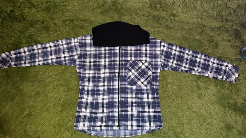Теплая флисовая рубашка в клетку с капюшоном для мальчика. Замеры:плечи 48см, длина по спинке 58 см, спереди 55 см, рукав 43 см. На молнии.