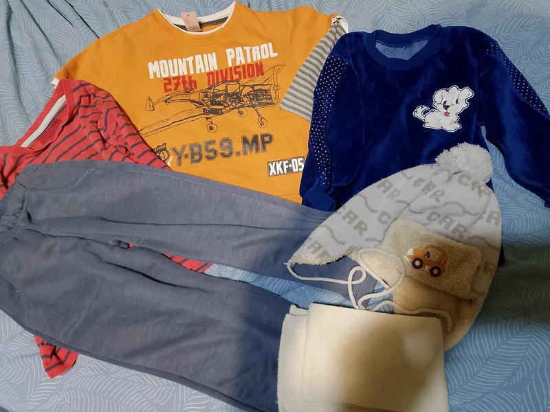 В идеальном состоянии, свитера,брюки, шапка+шарф.