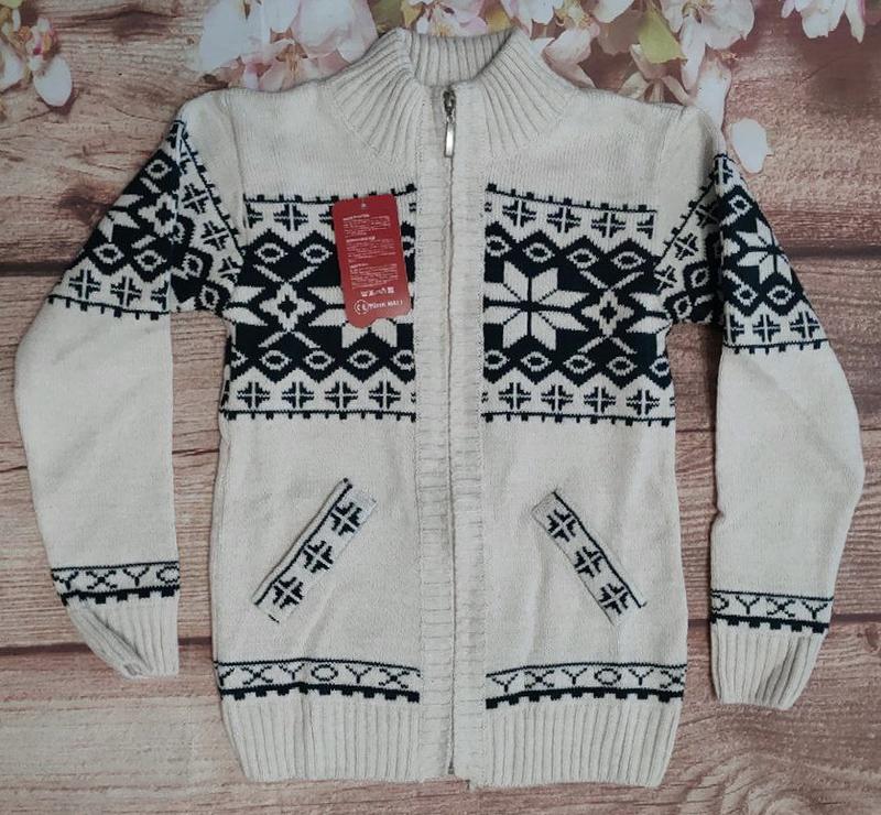 Кофта на молнии для мальчика. Трикотаж средней плотности. Производитель Турции. Состав: 30% шерсть, 70% акрил Размеры подбирайте по трем измерениям похибка -1см Размер 10-11 Длина рукава от плеча 49 Плечи 36 ПОГ 35 Длина 52
