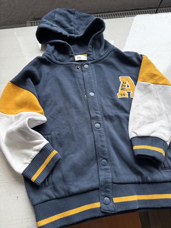 кофта бомбер -122 «C&A”Трикотажная,с начёсом.Состояние отличное.Замеры:длина-46,подмышками-40,рукав от плеча(приспущено)32,от капюшона-44