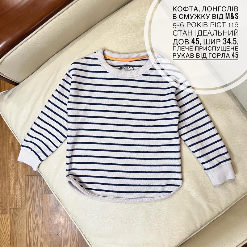 Кофта, лонгслів в смужку від M&S 5-6 років ріст 116 стан ідеальний дов 45, шир 34.5, плече приспущене рукав від горла 45