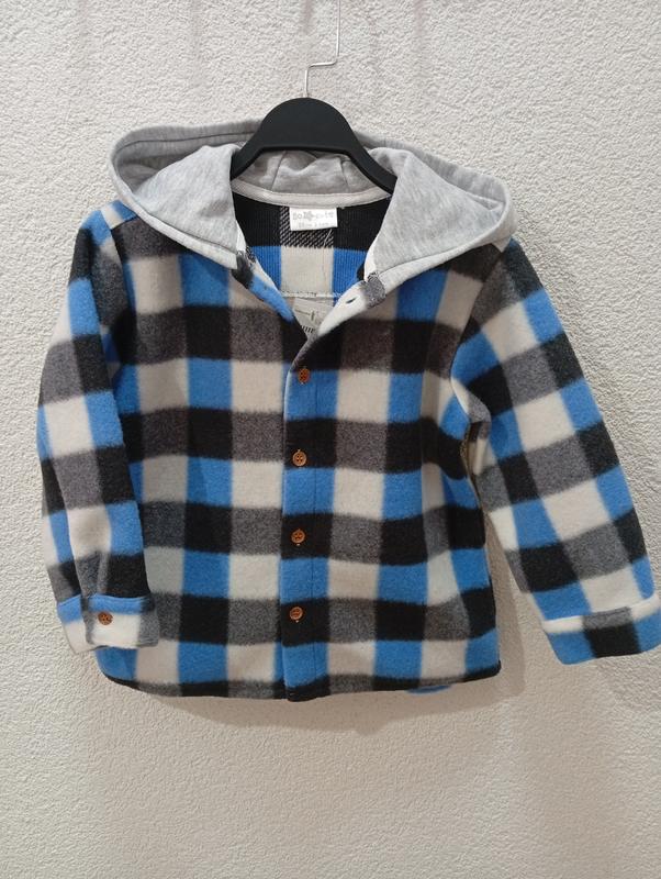 Это теплая флисовая куртка/рубашка с капюшоном. Капюшон серого цвета, застежки на пуговицах, узор в клетку. Идеально подходит для прохладных дней, как верхняя одежда или дополнительный утеплительный слой.