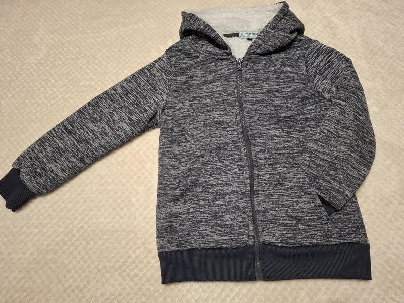 Очень теплая и мягкая кофта для мальчика. На замочке, имеет кармашки-кенгуру. Имеет такой же тёпленький капюшон и манжеты на рукавах и по низу кофты. Полноразмерный 134, будет хорош и на 128.