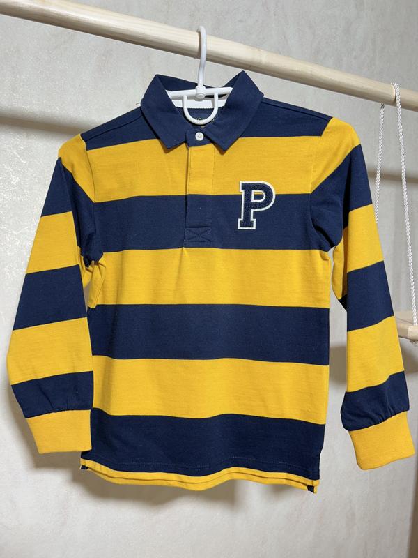 Кофточка для хлопчика Piombo з комірчиком 🩵 В стилі Поло 👌 В жовто-синю смужку, з буквою Р ✨ Ріст 116 см ( 6р.) Дуже класна якість 👍 100% коттон