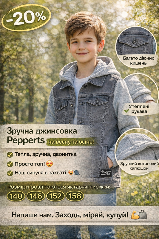 Качественная стильная джинсовка на кнопках от бренда Pepperts. Все накладные карманы действуют. Рукава с манжетиками, утепленный рукав. Сама джинсовочка - двухнить, идеально подходит на весну-осень. Капюшон коттоновый, очень качественный и стильный вариант для ежедневных образов. 📏 В наличии размеры: 140, 146, 152, 158.