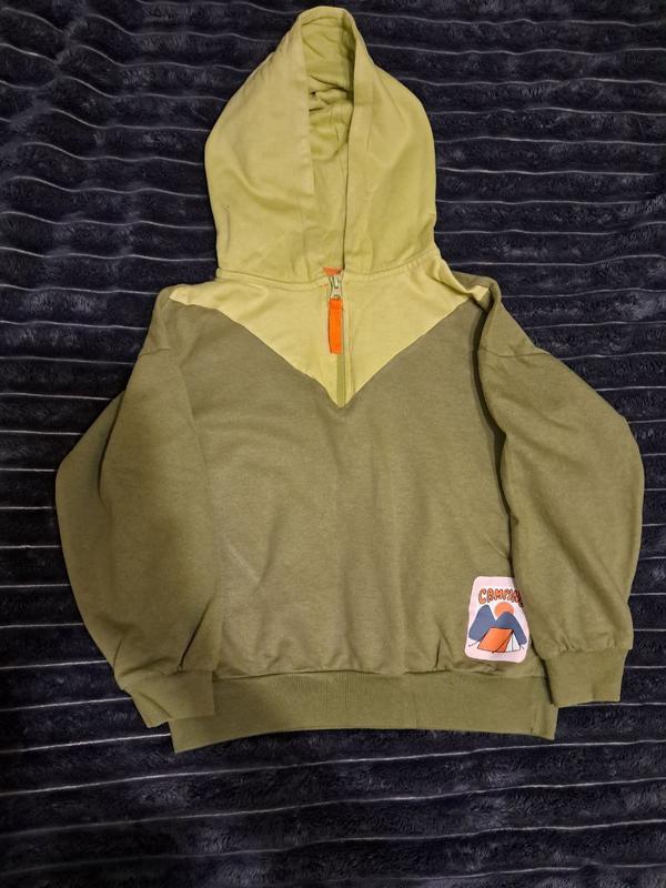 Стильная худи-анорак для мальчика Продам удобную и качественную кофту в приятных оливковых оттенках. Отлично подойдет для прогулок, садочка или активного отдыха. Дизайн: стильное сочетание цветов (колорблок), удобный капюшон и застежка-молния сверху. Декор: Милая нашивка Camping с палаткой. Состояние: красивое (удачно на фото), ткань мягкая и приятная к телу. Особенности: Манжеты на рукавах и снизу обеспечивают хорошую посадку.