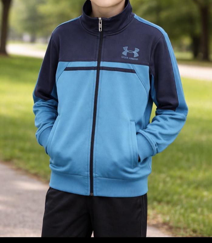 Кофта сидить трохи вільно, але акуратно, не оверсайз Комір-стійка щільно прилягає, виглядає спортивно 🔵 Верх темно-синій, низ — бірюзовий — виглядає яскраво, але не кричуще Логотип на грудях додає «спортивного вайбу» Добре поєднується з: чорними або темно-синіми спортивними штанами джинсами slim кросівками (білими або чорними) 👉 Стиль: спорт / casual (на кожен день) 👉 Посадка: комфортна, підходить і для школи, і для прогулянок Заміри: Плечі 35.5 Між пахвами 40 Довжина 52 Рукав 50