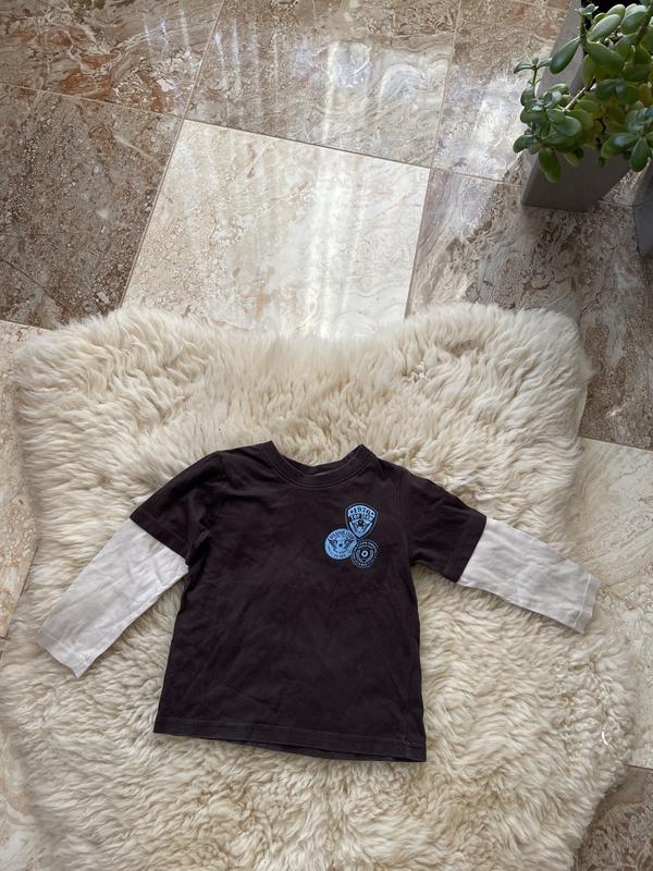Стильный батник в коричневом цвете с бежевыми рукавами и ярким принтом на груди.Качество отличное,хорошо стирается,носиться,приятный к телу. Отличный бренд. Длина изделия-39см,под руками-34см,плечи-27см,рукав-34,5см. Вещь после одного ребенка.
