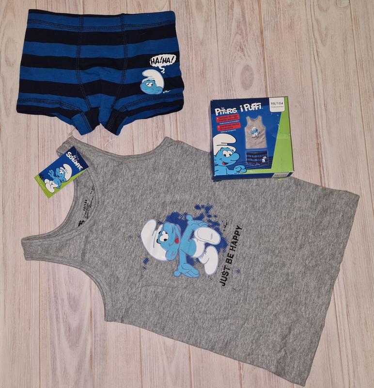 Комплект белья Смурфики, майка и трусы боксеры Lupilu мальчику Качественный комплект белья фирмы. Германия Майка и трусы-боксеры. Сделаны из приятного мягкого трикотажа с высоким содержанием экологически чистого органического хлопка Одежда сертифицирована международной системой тестирования текстильных изделий- Oeko-Tex Standard 100. 1-2 года Майка длина 41 см, ширина груди 26 см Трусы пояс 23 см, длина по бокам 15 см Цена 110 грн