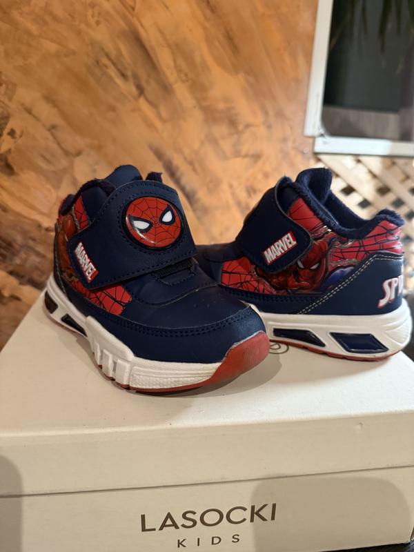 Детские, осенние кроссовки на мальчика. Очень удобный подъем, легкие, высокие на липучке легко одеваются, состояние хорошее, при ходьбе светится подошва.