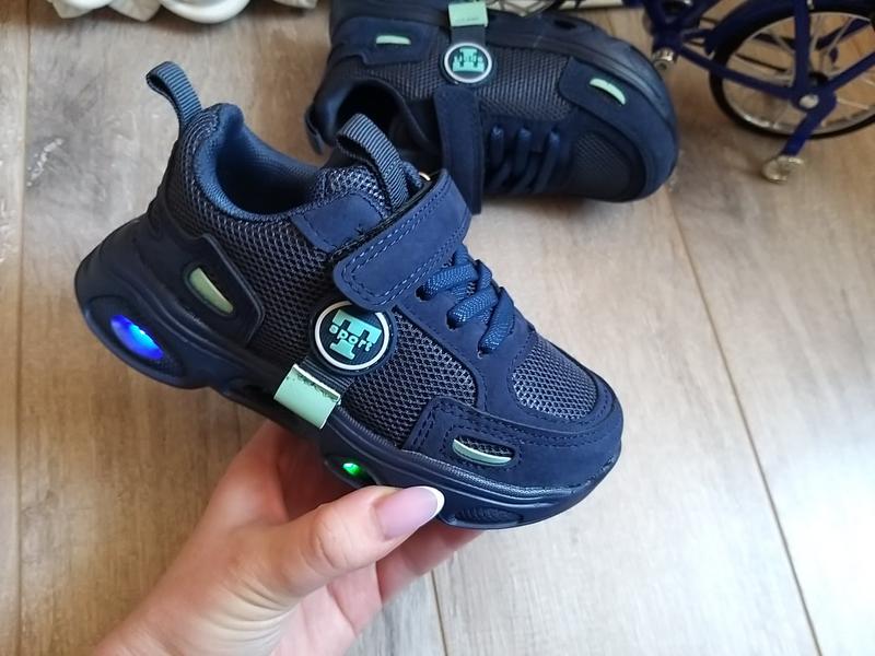 Кроссовки светящиеся на батарейках Еко-кожа и вставки текстиль.Стелька Кожаная+Супинатор Удобная застежка липучка Легкие очень качественные кроссовки Стелька внутри в см: р.28-17,5 см 15*