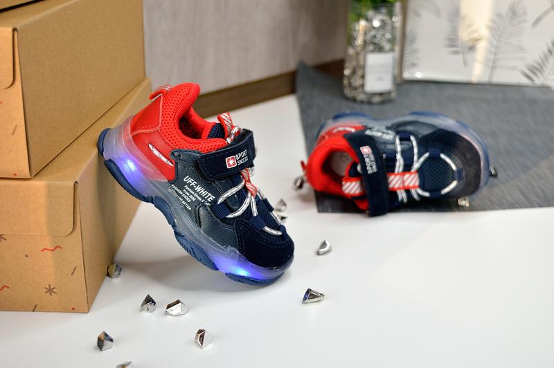 Суперские сине-красные светящиеся кроссовки.❤ Фиксируются с помощью липучки. Шнурок - декор. Стелька кожаная с супинатором. 385грн: 21р. - 14,0см 22р. - 14,6см 22р. - 14,6см 24р. - 15,6см ❗ Замеры сделаны внутри по стельке лично мной, погрешность 1-2мм допустима. 📦 УП за счет получателя +3грн упак.мат. НП оплата за доставку при получении..шеме