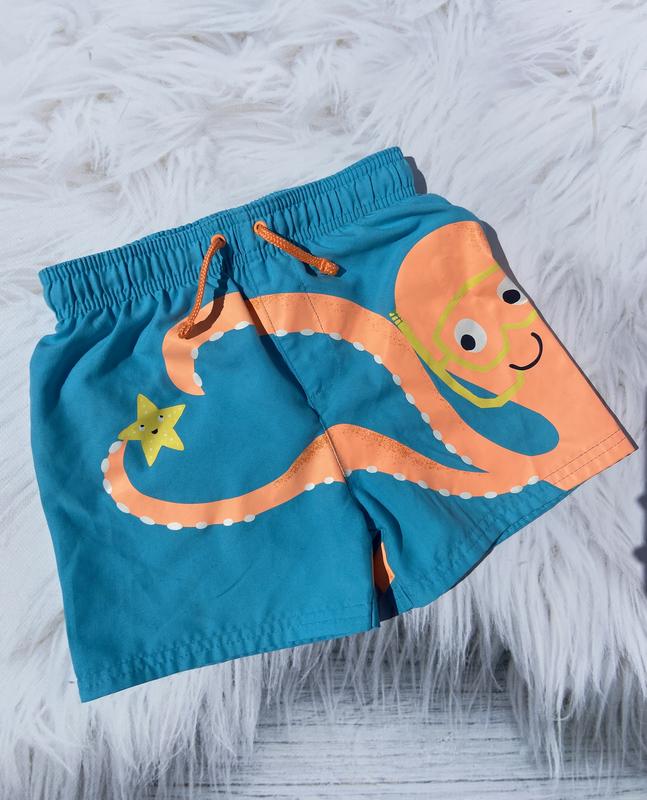 Продам вещи после своего сына. Купальные шорты с восьминогом George 4-5 лет на рост 104-110 см. Замеры: Пояс 25 см, длина 27 см. Состав: 100% полиэстер. Внутри белая подкладка в виде трусиков. Сзади на попе накладной карман. Шнурочок на талии рабочей, затягивается. Стан идеален, как новые Пересилаю. Смотрите другие объявления, есть еще много фирменной одежды на мальчика, нового и б.у. после своего сына.