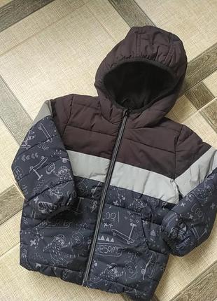 Куртка осінь-весна (підійде до -5 градусів). Флісова підкладка, але утеплена, не тонка. Знизу і рукава на резинці. Сірі полоски світловідображаючі. Довжина спини 43 см. Рукав від плеча 36 см, ширина під руками 35 см, плечі 28 см. Є невелика погрішність (останнє фото), але в носі не помітно.