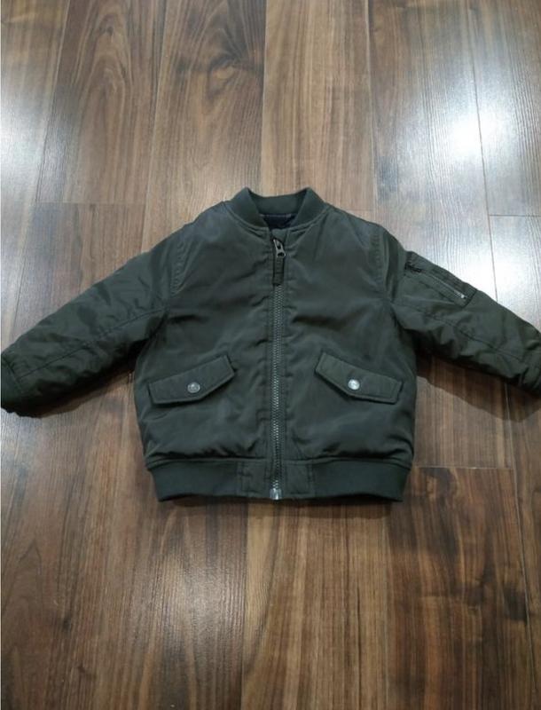 Дитячий бомбер Next , колір темно-зелений, тканина плащівка всередині на підкладці, з утеплювачем, внизу та манжети рукавів на гумці, розмір по бирці 1,5-2 роки (92 см), стан дуже гарний.
