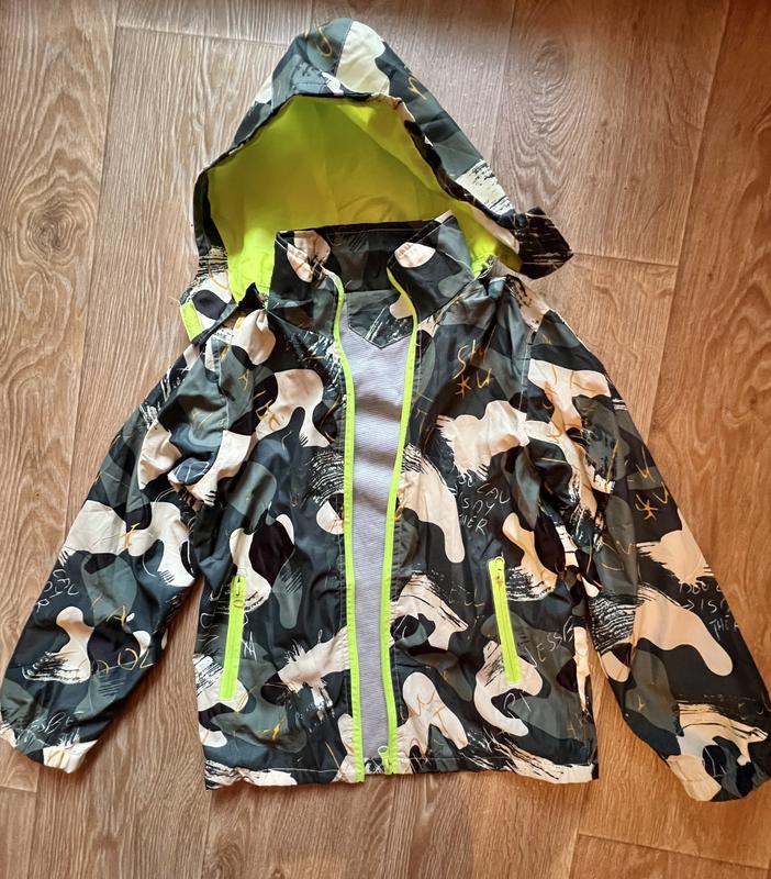 Куртка вітровка на хлопця, зріст 130 см. Стан ідеальний, вдіта пару разів. Ідеальна на дощову погоду. Капюшон відстібається. Довжина рукава 50 см Плечі 37 см Довжина 53 см