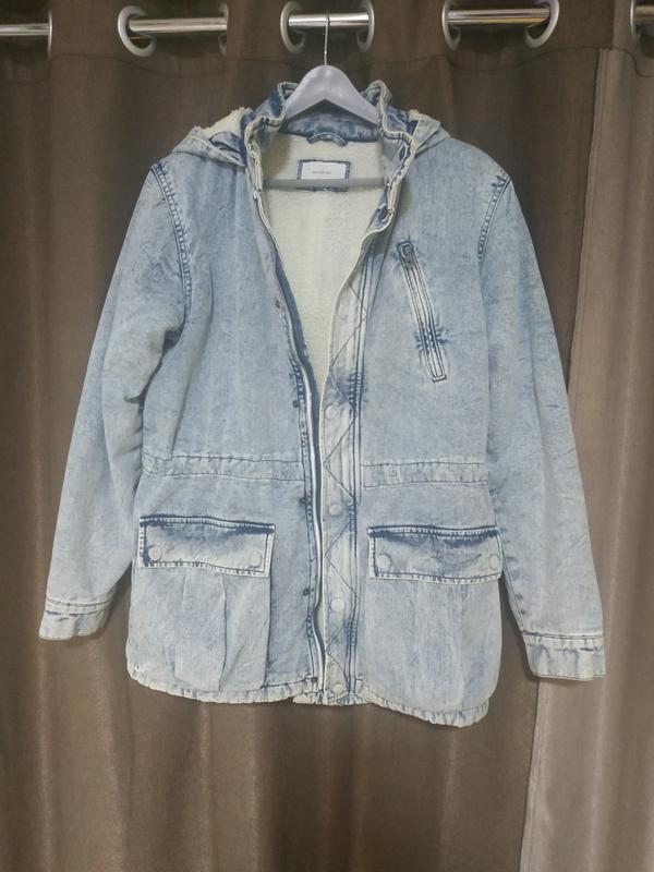 Куртка джинсова, м'ягка. В середині пришивне Еко-хутро, окрім рукавів. На поясі є підтяжки, для корегування по фігурі. Пошив рівний, вільний.