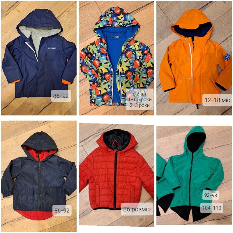 Куртки 1.Куртка дощовик на хлопковій підкладці. Тому не буде парити Дуже стильна Ідеальний стан Розмір 86-92 Ціна 355 грн 2. Вітровки ( 2 шт) Всередина на снинці і животику легенький фліс Дуже зручні на літо чи теплу весну. Ціна за 1 шт 255 грн Є куртка на 1-1.5 роки та на 2-3 Фірма George 3. Крутий оранжевий дощовик Має хлопкому підкладку, тому не парить. Дуже зручний та стильний Ціна 355 Стан ідеальний Розмір 12-18 місяців 4. Куртка на весну а осінь повністю на флісі ( спинка, животик та повністю ручки) Виробник український Evgakids Купляю точно таку куртку тільки в інших кольорах кожного року дітям, тому що дуже дуже якісні Ціна 550 Стан ідеальний Можна прати хоть кожного тижня в пральній і нічого не буде Розмір 86-92 5. Куртка від прімарк Без флісу Тепла осінь-весна Потрібно попрати лише Ціна 290грн 6. Дуже круті куртки знов від Evgakids Куртка на весну а осінь повністю на флісі ( спинка, животик та повністю ручки) Виробник український Купляю точно такі куртку тільки в інших кольорах кожного року, якість шикарна. Прати можна хоть кожного тижня і все супер буде Ціна за 1 шт 550 Маю в 2 розмірах 92-98 та 104 -110 Стан ідеальний, навіть катишок нема Маю ще до зелених курток круті жовті шапки Mrsirynak