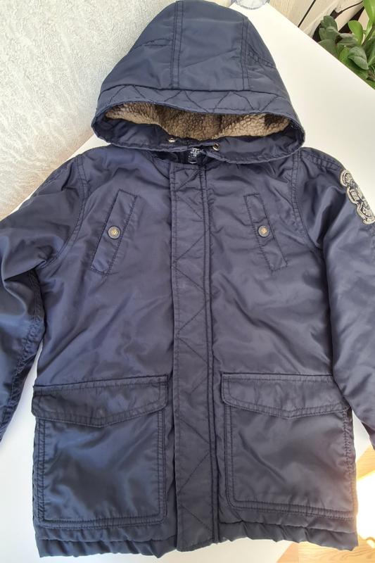 Куртка в хорошем состоянии, на молнии и защелках. Темно-синего колора, с карманами. Капюшон не снимается. На холодную осень, весну. Есть манжеты на рукавах Указан размер 4-5 лет - 110 Длина 49 Ширина 38 Рукав нижний шов 31 Рукав от плеча 40