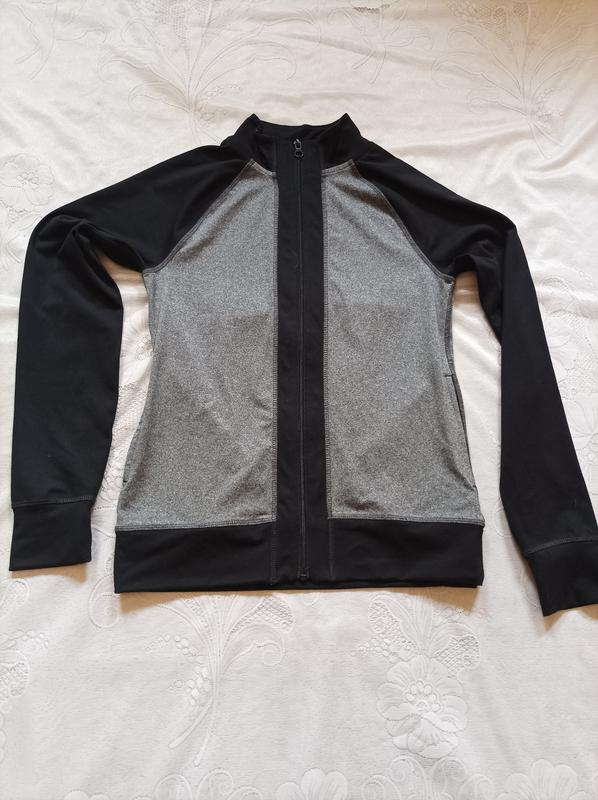 Куртка спортивная бомбер мягкая чёрно-серого цвета на разъёмной змейке. Рукава реглан на манжетах с прорезями для большого пальца. Внутренние боковые карманы. Воротник стойка. Все швы плоские. Состав: 84% полиэстера, 16% - спандекс. Ткань тянется. Указан размер14. Сделана в Индонезии для США. Посылка из США. Размер 14 ПОГ 40 Длина изделия 58 Длина рукава от шеи 70