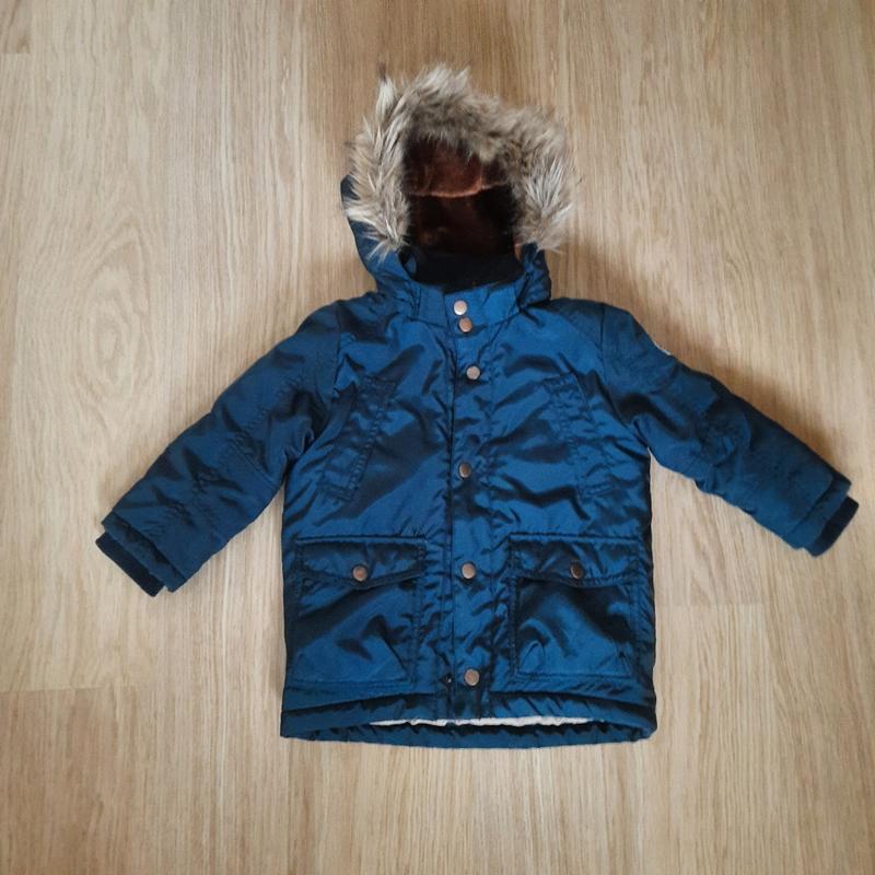 Теплая куртка HM для мальчика 2/3г. Верх туловища утеплен дополнительно искусственным мехом Дефектов нет, состояние отличное Замеры Плечі 30 Рукав від плеча 33 Довжина по спинці 47 ПОГ 39