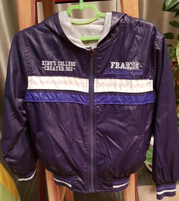 Куртка - бомбер для мальчика. Капюшон, наружные карманы. В очень хорошем состоянии. Демисезон. Дляна по росту спереди - 39 см, сзади - 43,5 см. Полуобхват - 37 см. Длина рукава - 43 см.Рукав на манжетах. Размер - 7/122.