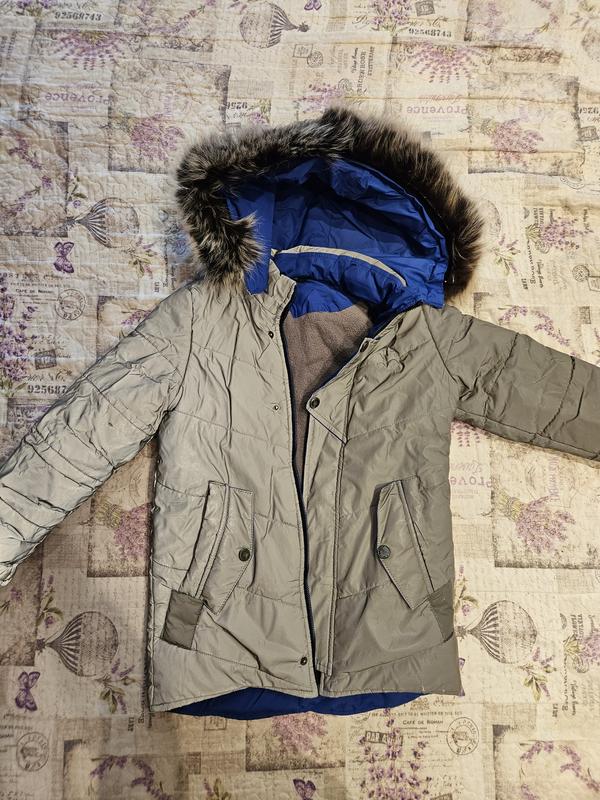 Зимняя куртка на мальчика 7-9 лет.Переливается на солнце.Внутри - флис.Капюшон и мех можно отстегнуть.Блискавака рабочая.Из недостатков- надерованный карман и кнопка на капюшоне.Довжина вил плеча 60 см, рукав от плеча 50 см.