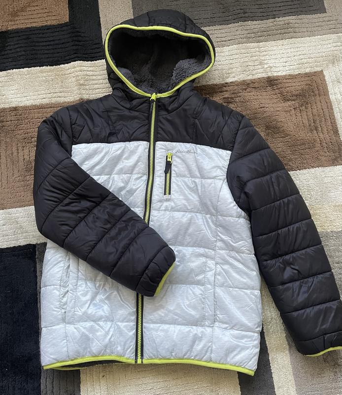Куртка подростковая, Eddie Bauer, красивого серо-черного цвета,двосторонняя,внутри теплое эко мех.размер L(14-16 р) но скорее на 12-14.(мы прогадали с размером) замеры-рукав 56см, длинна (по спинке)-60,ширина 50.