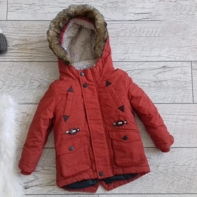 Очень классная качественная зимняя куртка фирмы M&S. Размер указан 2-3 года на рост 98 см. Снаружи плотная водоотталкивающая ткань,внутри на синтепоне и мягкой меховой подкладке. Мех от капюшона отстёгивается. Замеры: длина от плеча до низа(спереди/сзади) 42/45 ширина 36 Рукав от плеча 34 плюс манжет Плечи 30