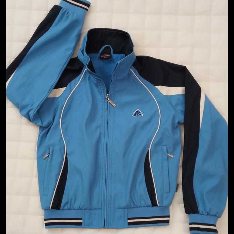 мастерка кофта .плотная ткань и тонкая голубая подкладка.цвет голубого черно белых цветов.был вижу капюшон есть скрытая пластик часть змейки.ну это неважно.они все идут без них.на груди вышивка брэнда.внизу два кармана на змейках с висюльками .рукава и низ плотные резинки.передняя змейка пластик скрытая по состоянию куртка между очень хорошим и идеальным...размер на бирке XL..😃.странновато...замер для этого:62 см.реглан рукав от шва стойки воротника*46- грудь*48- длина*34- низ резинка.
