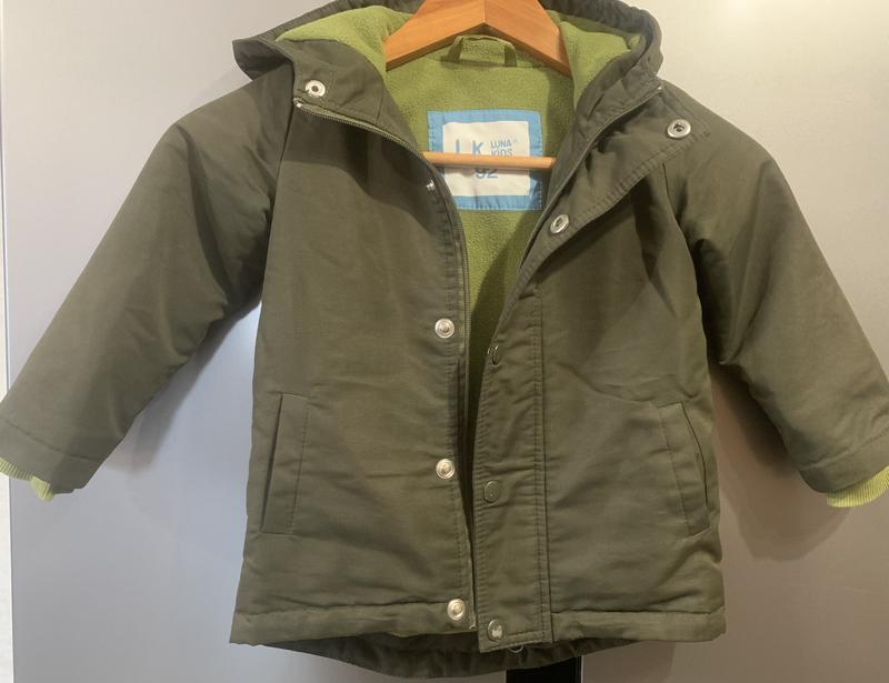 Детская парка 92 размер (подойдет на 92-98) цвета хаки Весна-осень Не промокает, не продувается Утеплена флисом, есть капюшон Есть манжеты на руках В идеальном состоянии (есть только протёртости на кнопках) Длина по спине 46 см (сзади удлиненная) Длина спереди 42 см Длина рукава 32,5 см