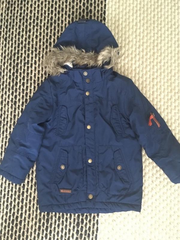 Утепленная демисезонная курточка удлиненного кроя.Син носил до 7, 5 лет. В рукавах есть манжеты, капюшон отстегивается. Стан-очень хорош.