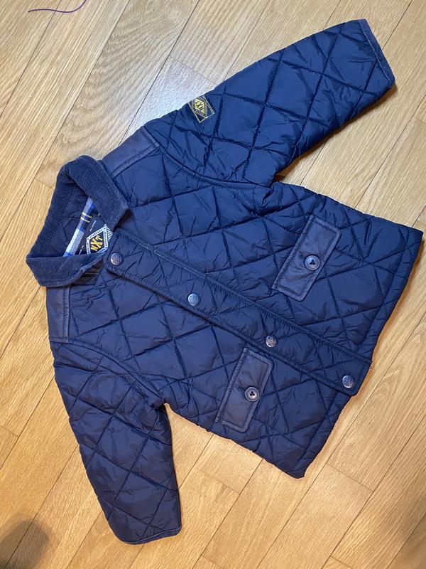 Очень классная детская курточка в классическом стиле от Next. Легкая, утепленная, сезон весна-осень. Стан идеален. Размер 12-18 месяцев, на 86 см. Длина 37 см Плечи 27 см Рукав 27 см