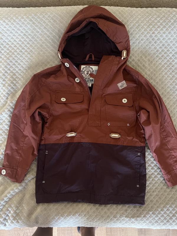 Куртка в идеальном состоянии, надевается через голову, подойдет на весну и на начало осени, не пропускает ветер и воду,очень стильная.на 7 лет на рост 128