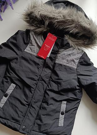 Вверхний материал - ветронепродуваемый и водостойкий. Капюшон не отстегивается, внутри плюшевая подкладка. Наполнитель - силикон. Рукава с вшитыми трикотажными манжетами. Спереди - карманы на кнопках. Сезонность: холодная осень, теплая зима. Состав: 100% полиэстер. Сток. Куртка новая с бирками.