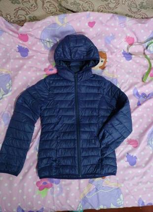 Куртка демисезон, плащевка.Мает капюшон притачной, два кармана наружные и два внутренних на рост 152 см, размер 42-44.красивый темно-синий цвет.верж и подкладка из водонепроницаемой плащевки.