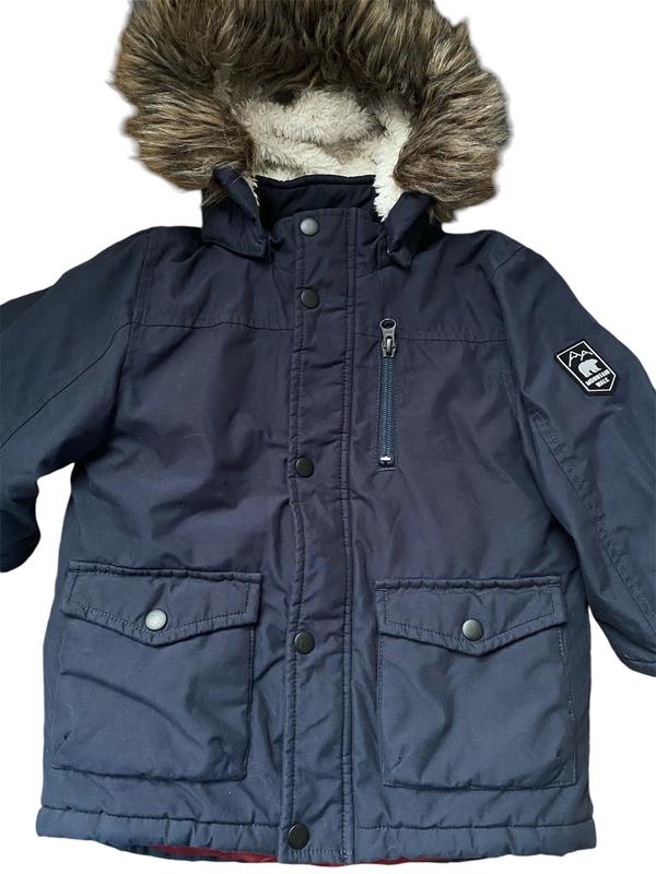 Напів грудей 38, довжина 48, Довжина рукава від капюшона 40 Подовжена куртка-парка Name it для хлопчика. Особливості: паропроникність – 3000 г/м2/24 години; спереду застібка "блискавка" YKK із захистом підборіддя та вітрозахисною планкою на кнопках; водовідштовхувальна обробка ECO без застосування фторовмісних речовин; знімний капюшон з окантовкою зі штучного хутра; функціональні кишені; подовжена ззаду; вітрозахисні манжети на рукавах; світловідбивні деталі; рекомендований сезон – зима.
