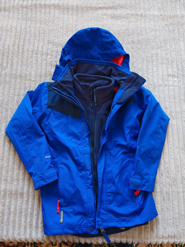 Куртка Karrimor детская 3 в 1 (ветровая, флиска) Можно носить вместе и по отдельности. Стан идеален (обедалась несколько раз, потому что была еще одна основная). Есть затяжки на подкладке (показано на фото: при стирке прилипли липучки куртки) Размер 122-128 Материал: 100% полиэстер Цвет синие + темно-синий Ветрозащитная, дышащая, влагоотталкивающая ткань капюшон прячется в воротник 2 внешних кармана манжеты рукавов на липучках Замеры ветровки: Длина по спинке - 58см Рукав 48см ПОГ 40см Замеры флиски: Длина по спинке -48см Рукав 46см ПОГ 34см