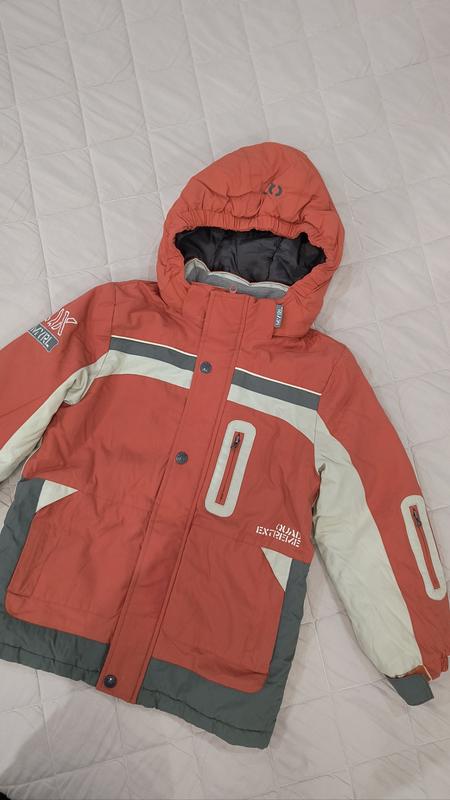 Тепловая куртка на мальчика 6 лет. Цвет не яркий. Стан на фото. Детская куртка фирменная в отличном состоянии. Рукав 43см, длина 54см, ширина 42 см, плечи 35см. Капюшон снимается. Местами являются незначительные малозаметные пятнышки, как от порошка - см.фото Очень теплая и практичная куртка.