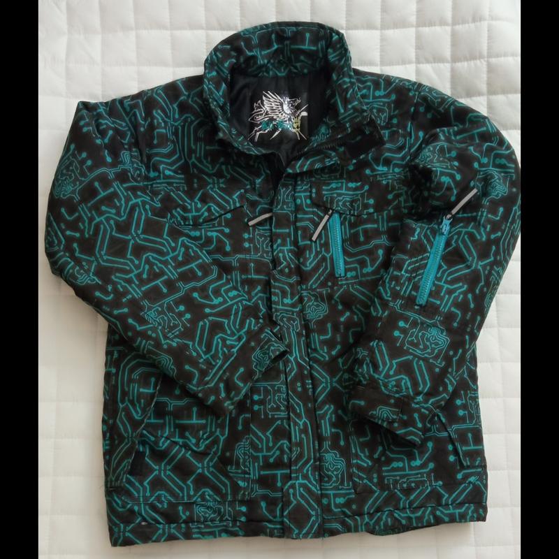 куртка черно зелёная.теплая на синтепоне толстенькой.рисунок радиомикросхем.капюшоне нет но был.омтались кнопки за воротником.воротник стойка.4 кармана спереди врезные с клапанами на прилипках.один + на змейку.передняя змейка пластик крупный с закрывающей ее планкой на прилавках.рукава двойные на пряжках прилипках стяжка.внутри внизу от талии на резинке фото типа фартука на прилипках для застёжки пояснице от холода на прилипках. по бокам два кармана врезных на змейке.состояние очень хорошее как и куртка.на правом рукаве под мышкой. 8 см.по шву! зашито рукой.не видно совсем.есть машинка?! можно прошить...)не обязательно.этл ведь неовпное а шов разошелся.все 100% полиэстер.замер:40- плечи*54- грудь*69.5- спина*57- рукава*52- низ* воротник -7.5 см.