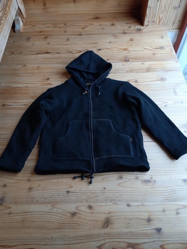 Черная шерстяная вязаная куртка с капюшоном, утепленная флисом,размер М.Замеры:плечи 48 см, пог 52 см, длина рукава 53 см, длина куртки 56 см