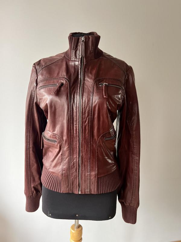 Куртка -бомбер з натуральної шкіри бренду Marc OʼРоlo, нова без навісної бірки. Це видно по підкладці та коміру. Комір, манжети та них куртки з трикотажу. Є 4 кишені на блискавках. Розмір S-M. Колір темної вишні. Заміри: від пройми до пройми-46 см, пот-42 см, пос. тягнеться до 44 см., довжина рукава-63 см.