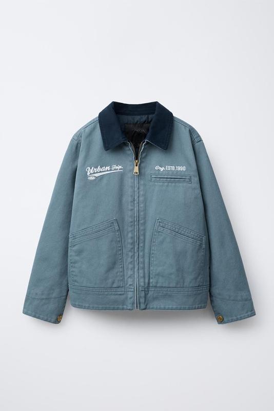 Куртка из твила и вышитыми элементами, в серо-голубом цвете, для мальчика от Zara - Отличное качество. - Стильная, легкая и удобная. - Прямого кроя, по типу пиджака, спереди на молнии. - Отложной воротник контрастного цвета. - Рукава снизу на кнопке, регулируются по ширине. - Внутри прошита подкладка. - Наполнение - тонисенький слой синтепона. В наличии размер: 152 (на 11-12 лет). Замеры: 152 - длина по спинке - 58 см; ширина в плечиках - 42 см; длина рукавчика от плеча - 56 см (от горловины - 69 см); ширина в груди (под проймами) - 52 см.