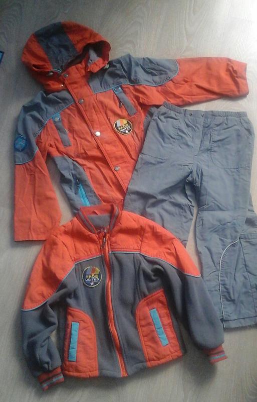 Комплект: куртка-ветровка, штанишки, кофта флисовая. Кофту можно носить отдельно или же как подстежку к куртке, для утепления. Цвет яркий, как на фото. Вышлю дополнительные фото и замеры. Указан рост 92, но вполне подойдет на возраст 3 года)