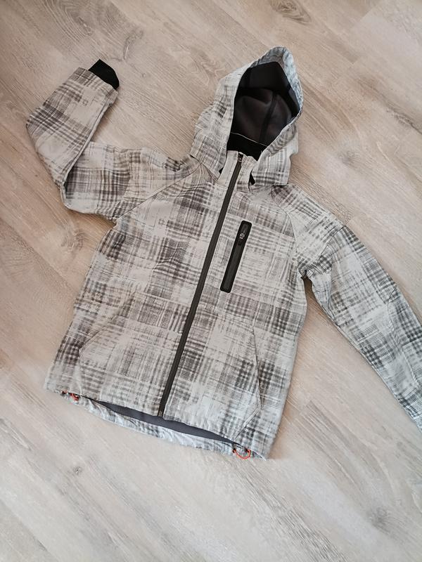 Курточка в идеальном состоянии, лыш держатель бегунка чуточку надломился(на фото показала),весная-оньзнутри флис,ткань софсшелл, капишон снимается,цвет свет серый с серым рисунком. Длина -60/66 см Под рукавами-50 см Низ -49см Рукав от горловины-68/46 см+5 см манжет Безпечна доставка лиш Новою Почтою, а укр почтою повна оплата! Смотрите все мое объявления есть много интересного.