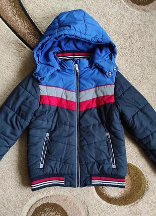 Все добре, але дефект на останньому фото на рукаві невеликий поріз, тому ціна така. Куртка тепла, зима. Розмір 128-134, заміри на фото.