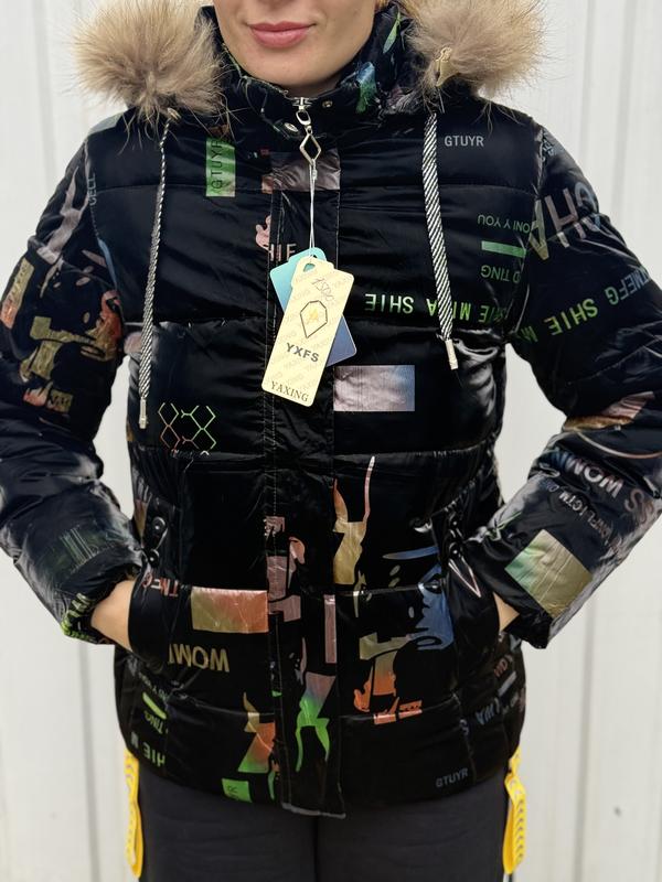 Стильна чорна куртка з глянцевим ефектом і яскравими принтами. Тепла, легка та зручна у носінні. Має глибокий капюшон із пухнастим хутром, що надійно захищає від вітру та холоду. Застібка — блискавка із декоративним кільцем. Ідеальний варіант для щоденного образу взимку ❄️